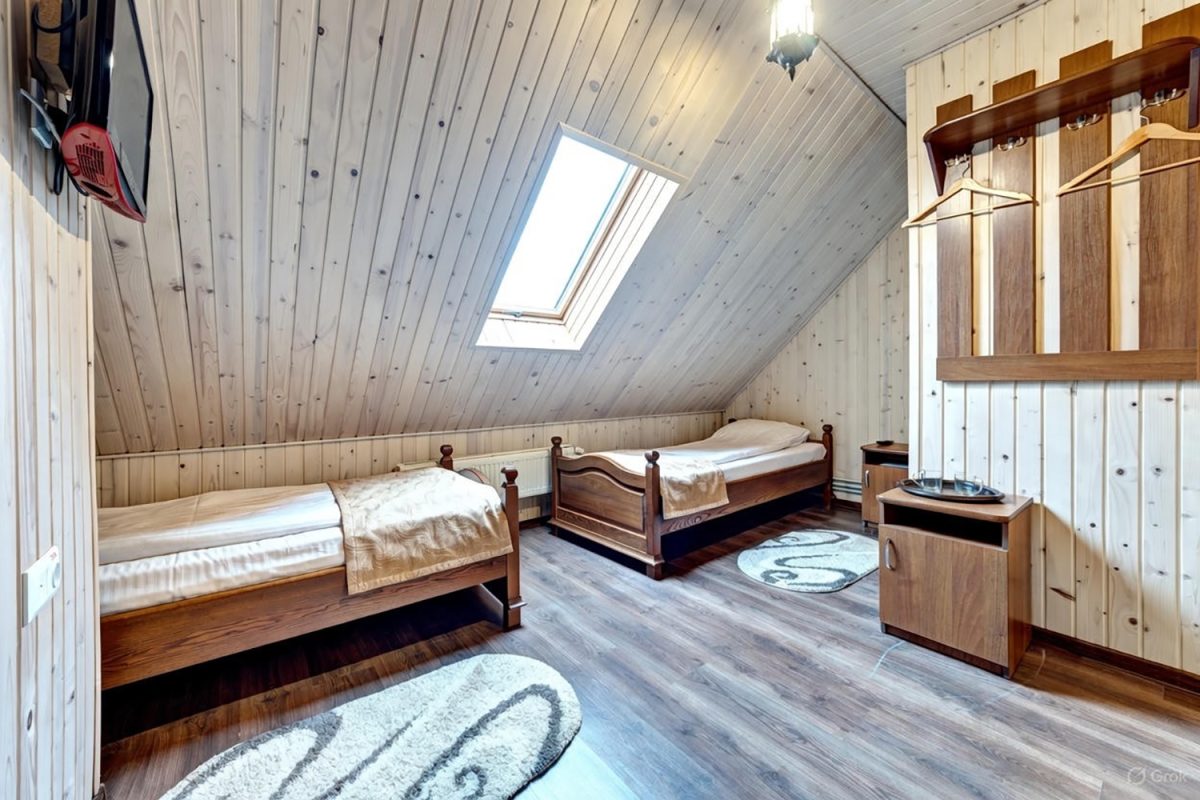 Компактний мансардний номер в Буковелі з двома ліжками — чудове рішення для бюджетного гірського відпочинку.